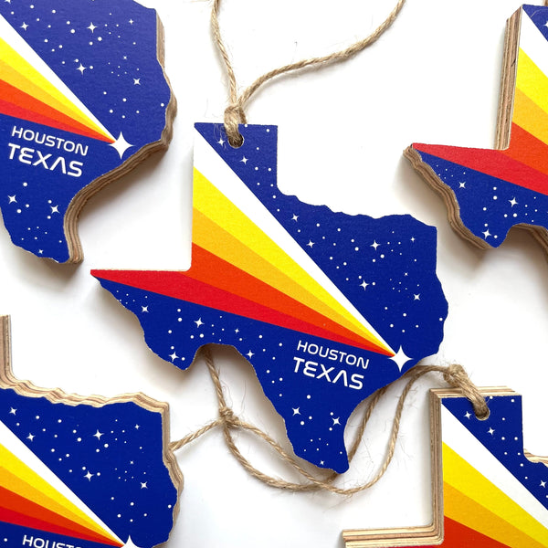 When we started thinking about what a Houston-themed ornament would look like, we immediately thought of two things: the Houston Astros and NASA. Houstonians love their baseball team, and they love their Space City connection with NASA, so we decided to try to honor both with this colorful Texas ornament.